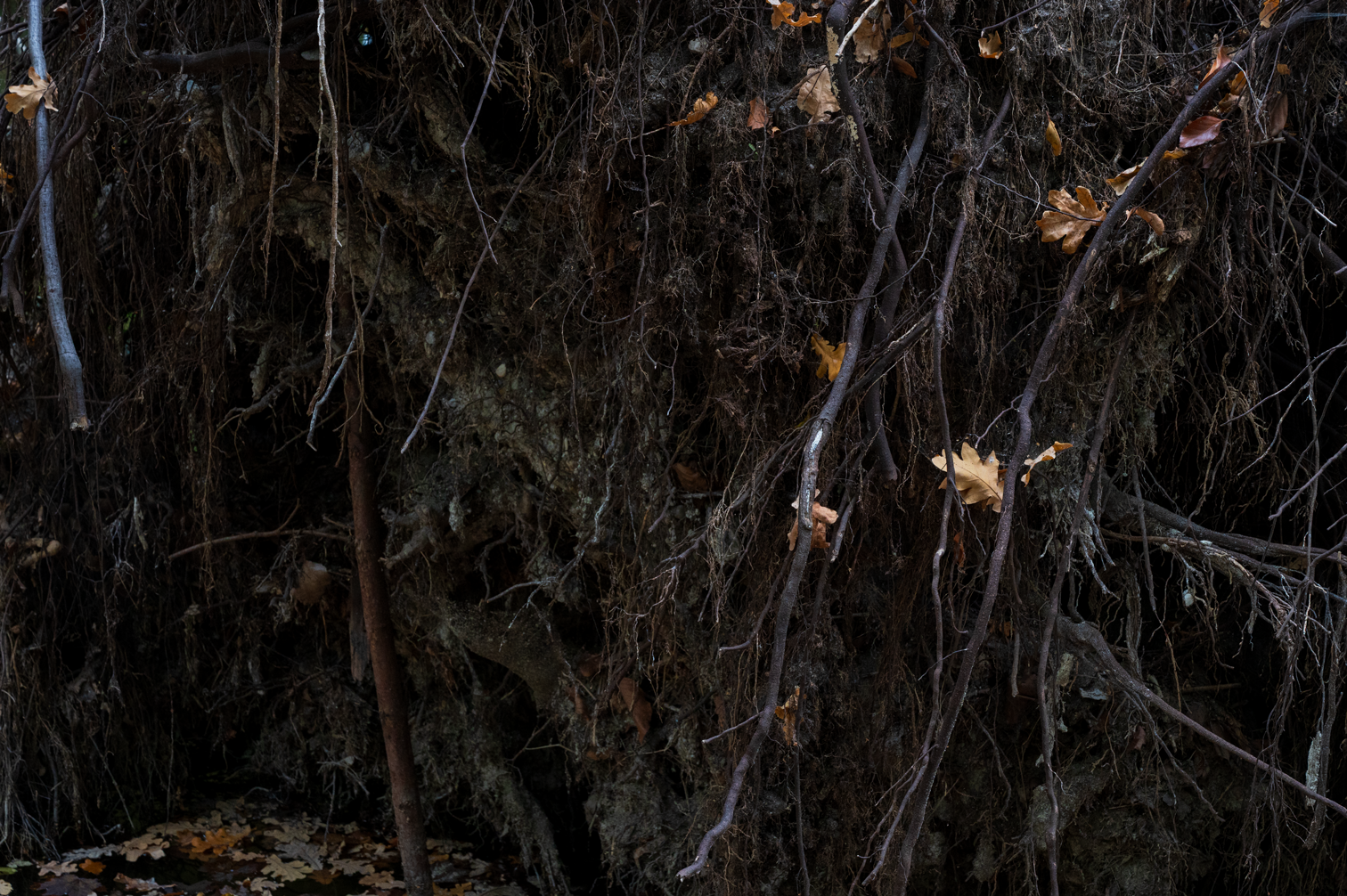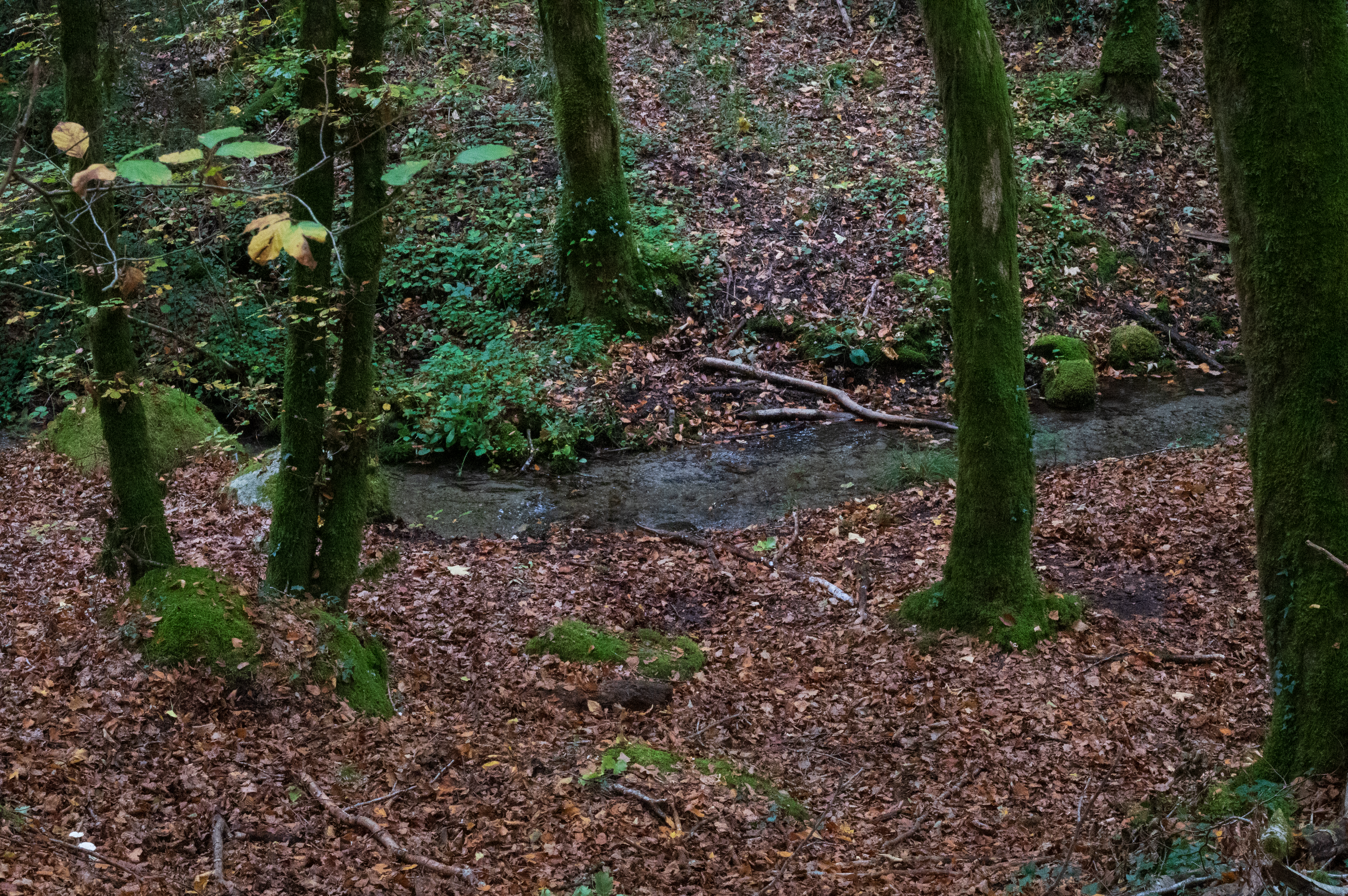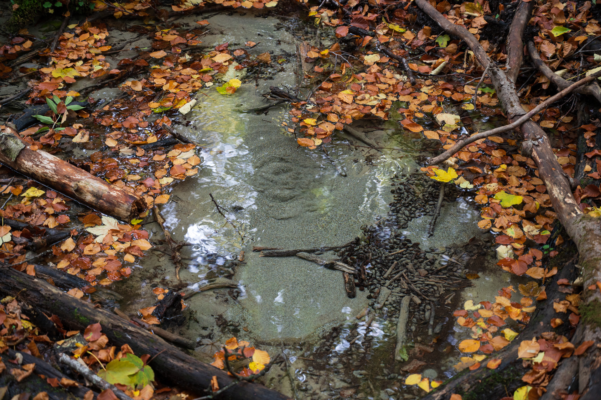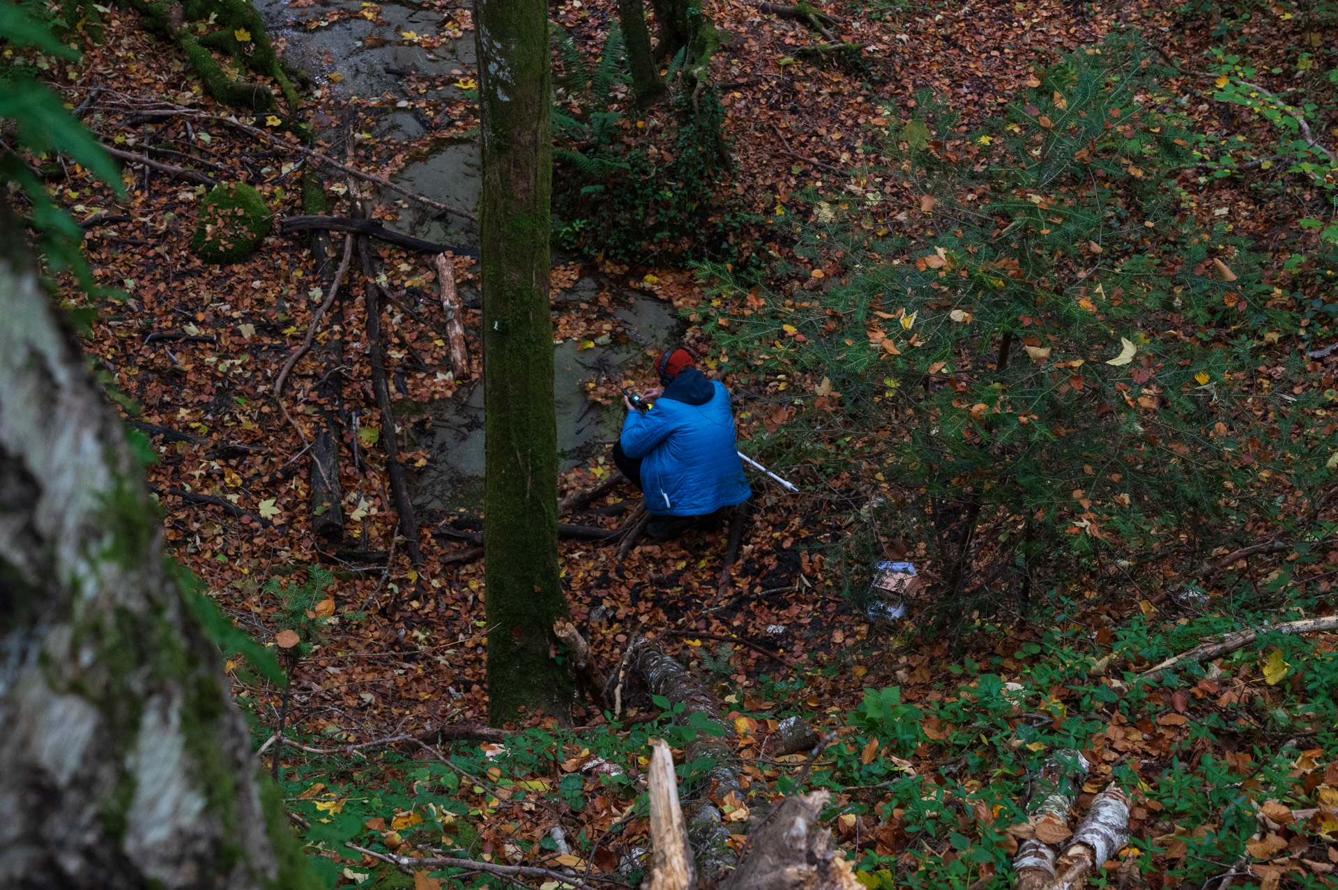 I did go up the cliff to get an overview of the source as my first POV. I initially went uphill too because I didn't want to disturb Benoît while he did his hydrophone recordings (which he shared with me if I wanted to use, so thank you!). I spent about 15-20 minutes up by the cliff. I don't know what I was looking for but maybe to see if I could find traces of water still somewhere. I started to get scared that I would get lost because it's a forest with no defined path. This was my intention for my protocol, to be dis-oriented but I also didn't have cell reception so I didn't want to get completely stranded.