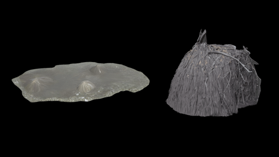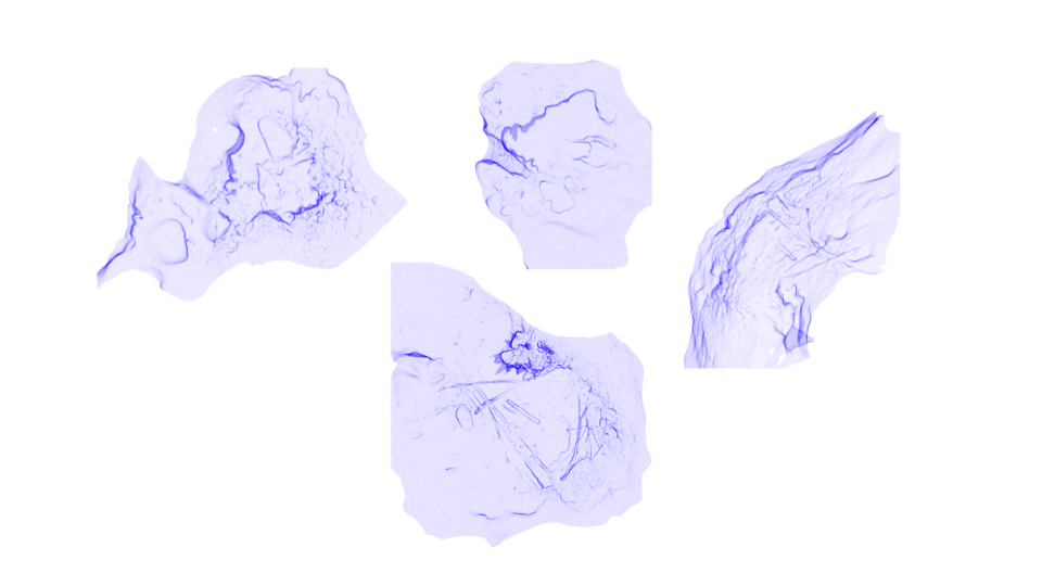 These are exports from the aerial plan of the photogammetry models. The shape and colour is determined by Polycam. What I find interesting is that I don't see these are geographic plans, but instead illustrations. For example, these look like fish, a head with a face, intestine or bacteria. Of course, these aren't 100% accurate because this is taken from a series of photos on my phone and then converted to 3D models. But what I'm looking for here is a process of creating a form of the Boiron based on it's location, based on what is unique to it.