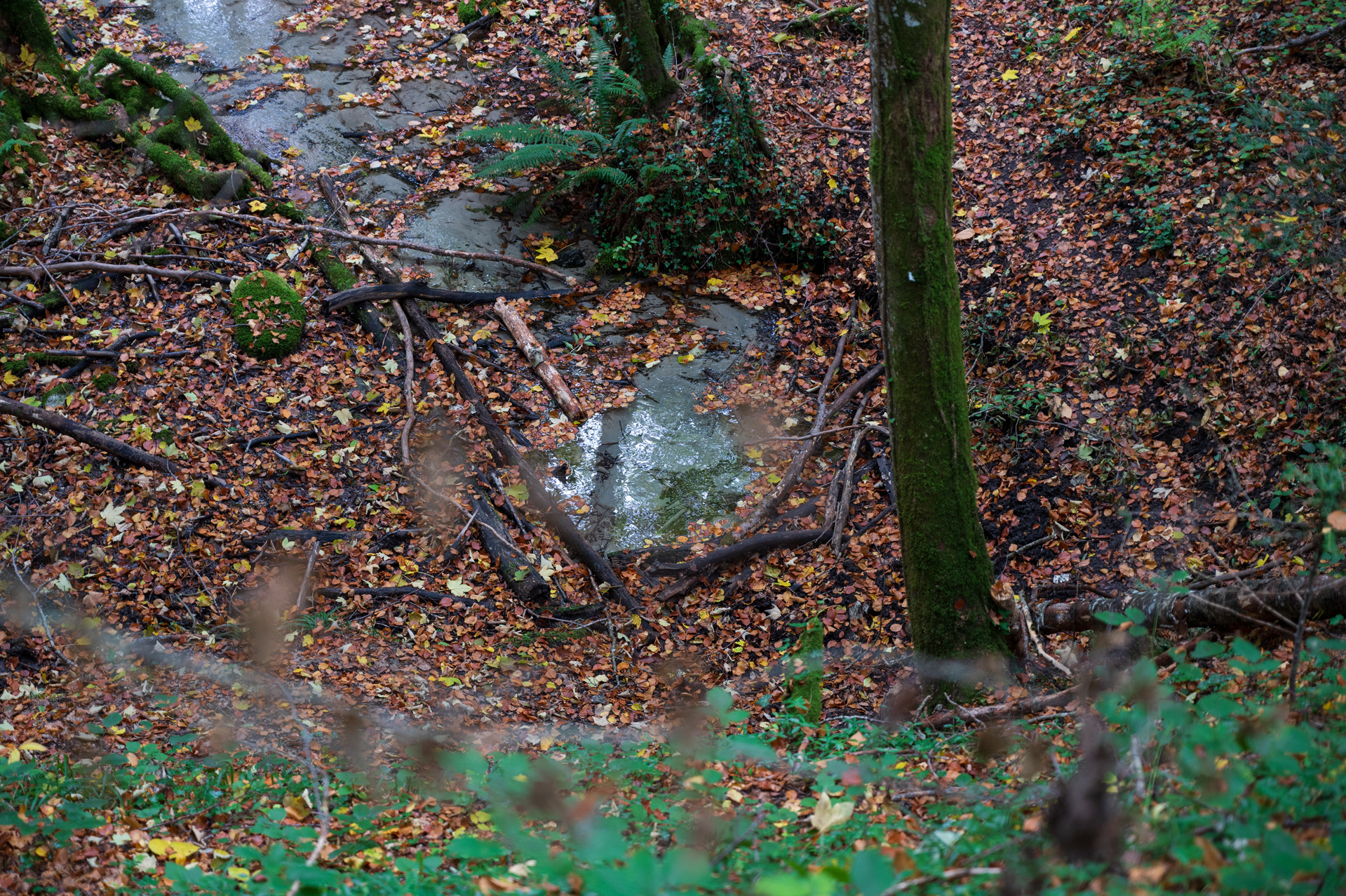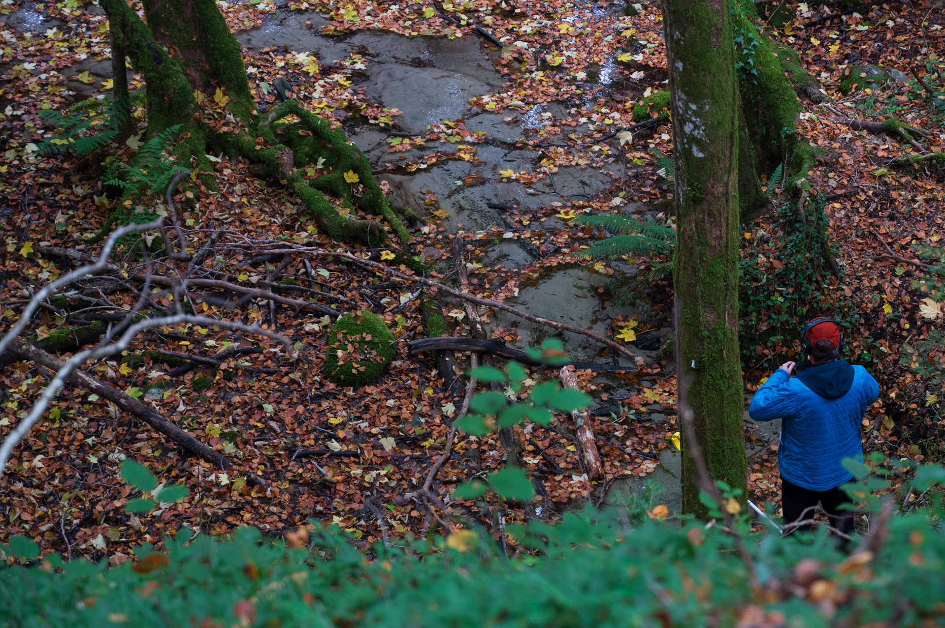 I did go up the cliff to get an overview of the source as my first POV. I initially went uphill too because I didn't want to disturb Benoît while he did his hydrophone recordings (which he shared with me if I wanted to use, so thank you!). I spent about 15-20 minutes up by the cliff. I don't know what I was looking for but maybe to see if I could find traces of water still somewhere. I started to get scared that I would get lost because it's a forest with no defined path. This was my intention for my protocol, to be dis-oriented but I also didn't have cell reception so I didn't want to get completely stranded.